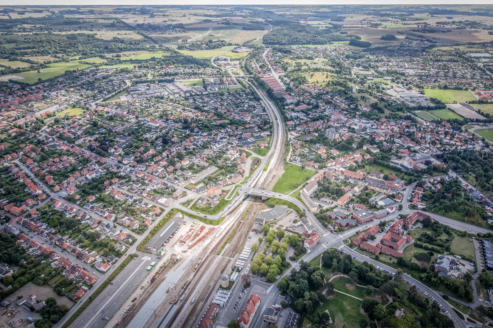 Næstveds borgmester Carsten Rasmussen og Banedanmarks projektdirektør på Ringsted-Femern Banen holder taler og klipper den røde snor, som i dagens anledning er spændt ud tværs over gaden.