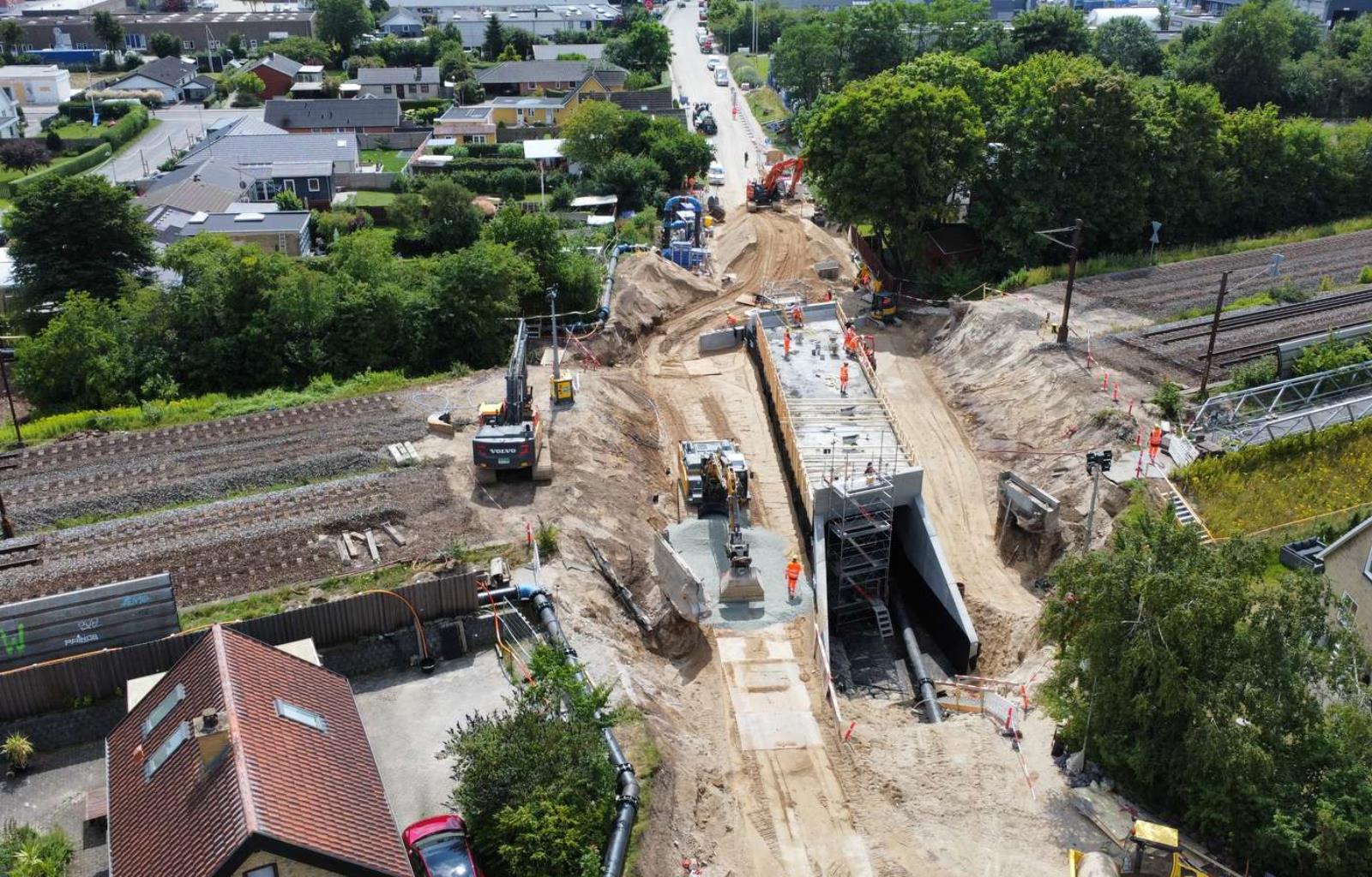 Nogle dage senere er samtlige betonelementer monteret, og projektet kan fylde stabilgrus op omkring den nye stitunnel, inden spor og kørestrøm genetableres.