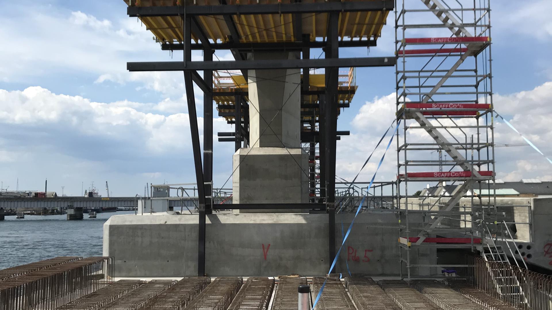 - Broen består af 5 bropiller og 6 brodæk. De vejer i omegnen af 1100 tons stykket