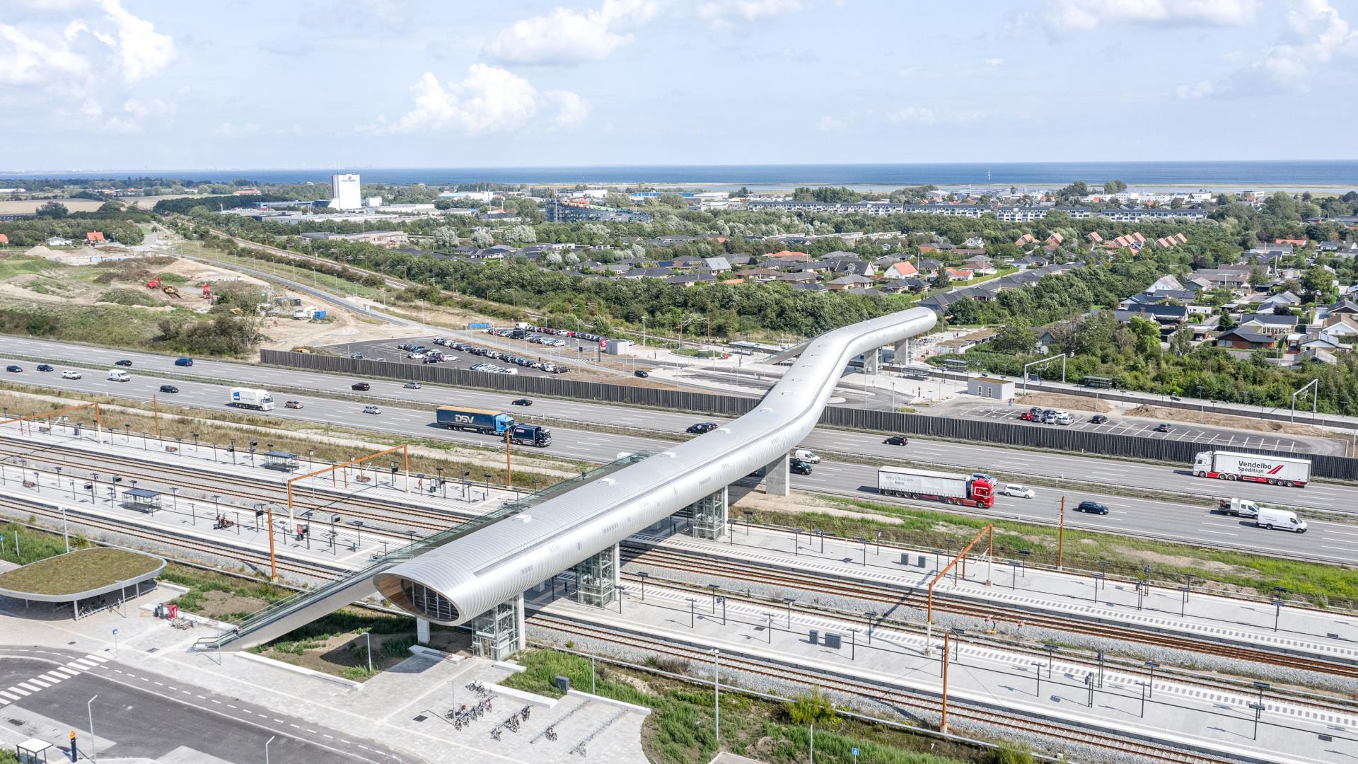 Køge Nord Station, der med sit spektakulære design, som bugter sig over motorvej og jernbanen, giver pendlerne fra både Køge og omegn og fra resten af Sjælland bedre muligheder for at stige på den kollektive transport.