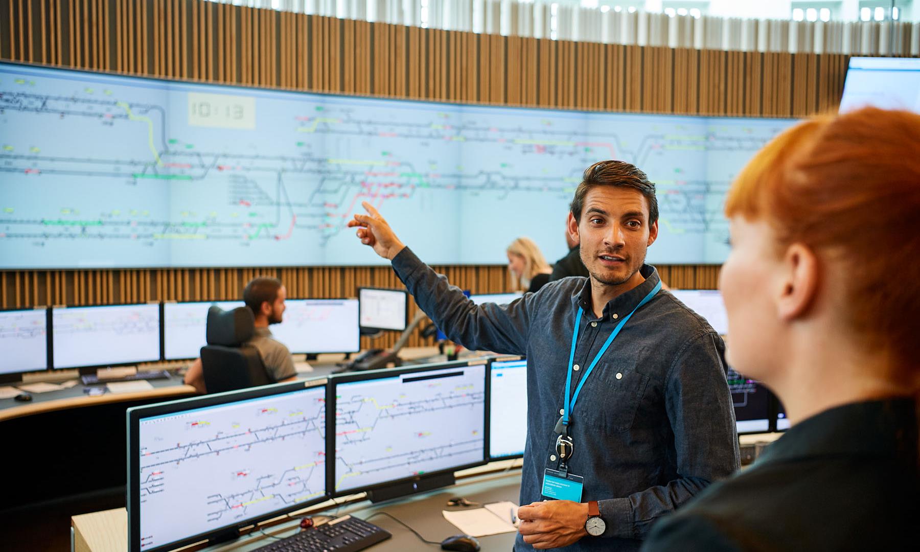 Fra besøgsbalkonen på 8. sal kan du se det bueformede kontrolrum for S-banen, og du har rig lejlighed for at tale med trafikledere om deres daglige arbejde og det nye signalsystem.
