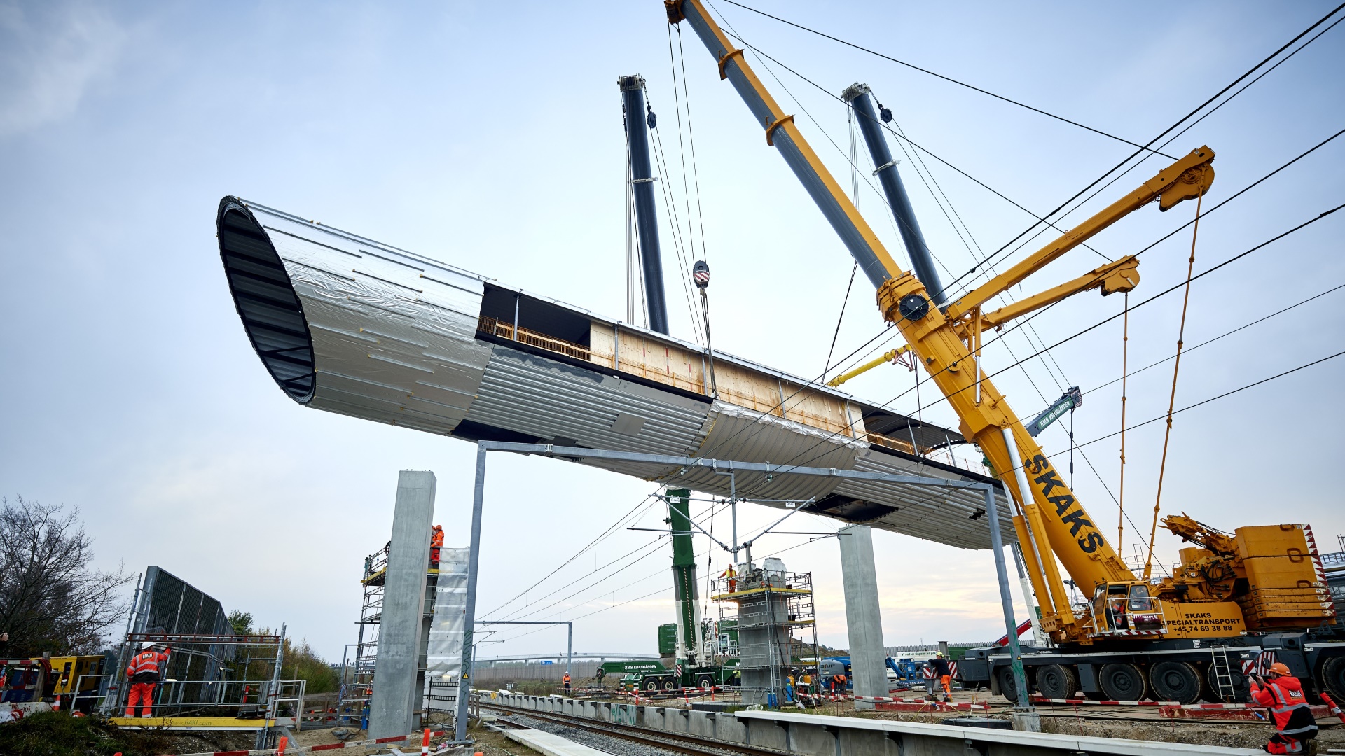 Arbejdet med Køge Nord Stations gangbro går ind i næste fase, når vi fra fredag den 15. december og frem til mandag den 18. december hejser stationsbroens næste broelementer på plads henover Køge Bugt Motorvejen