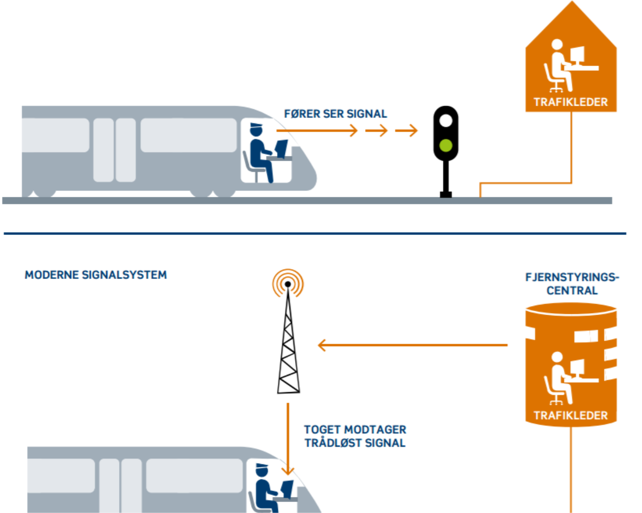 Med det nye signalsystem modtager lokomotivføreren køresignalet direkte på en skærm i førerrummet via radiokommunikation. Det betyder, at de signaler, der i dag står langs jernbanen, i fremtiden fjernes.